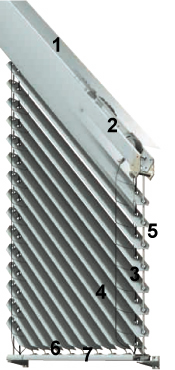 2 Oberschiene 3 Aufzugsband 4 Lamellen 5 Seitenführung 6 Lamellenführung 7 Unterschiene |